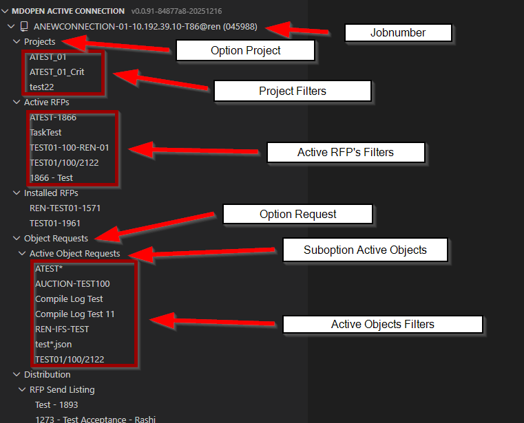 The MDOpen Active Connection panel is activated once a connection to an MDCMS instance is established. The panel primarily shows the menu with all visible options, along with filters for those options.