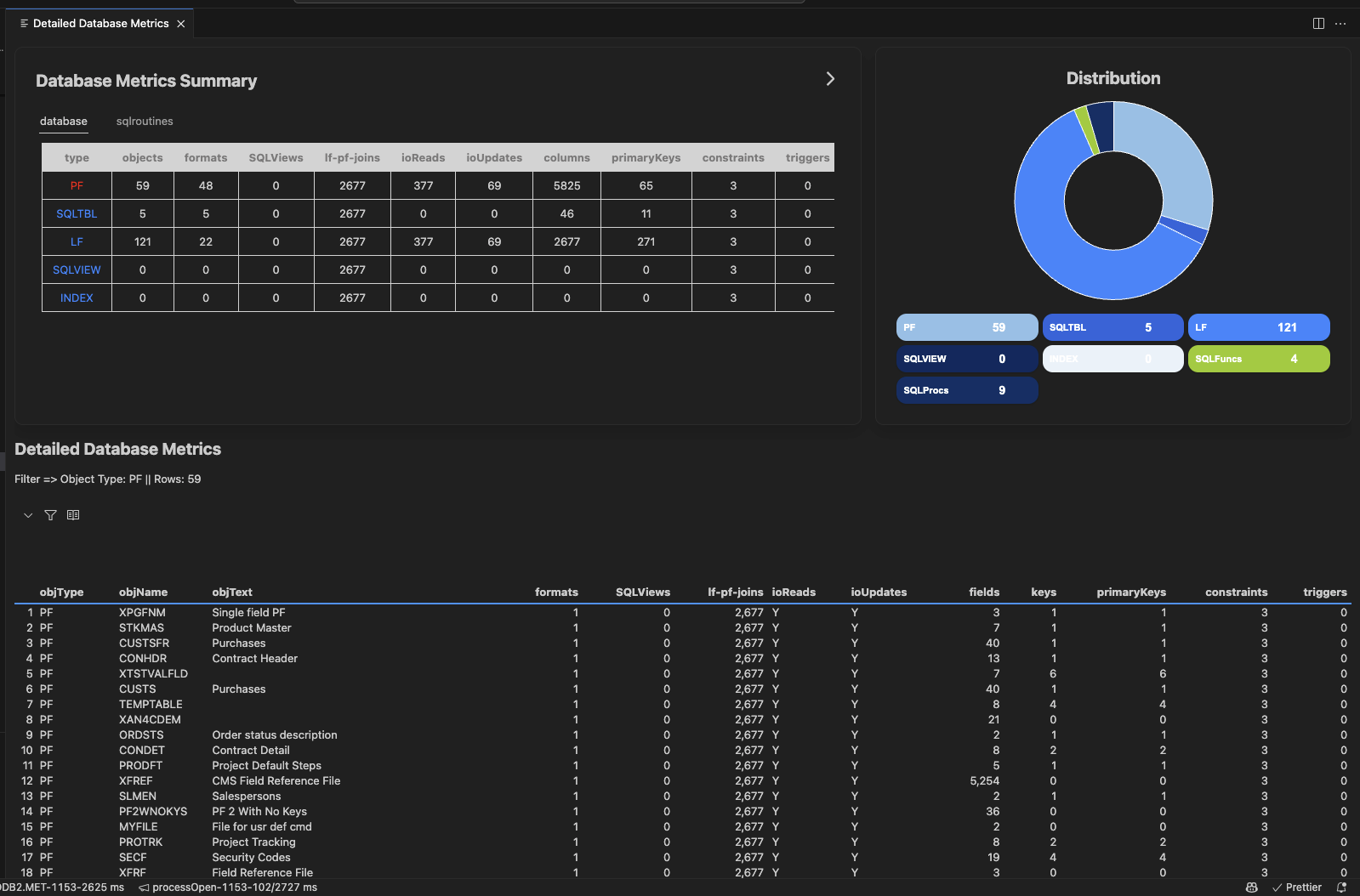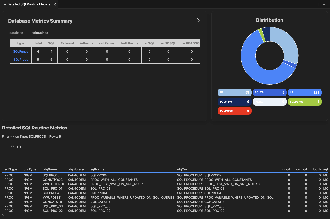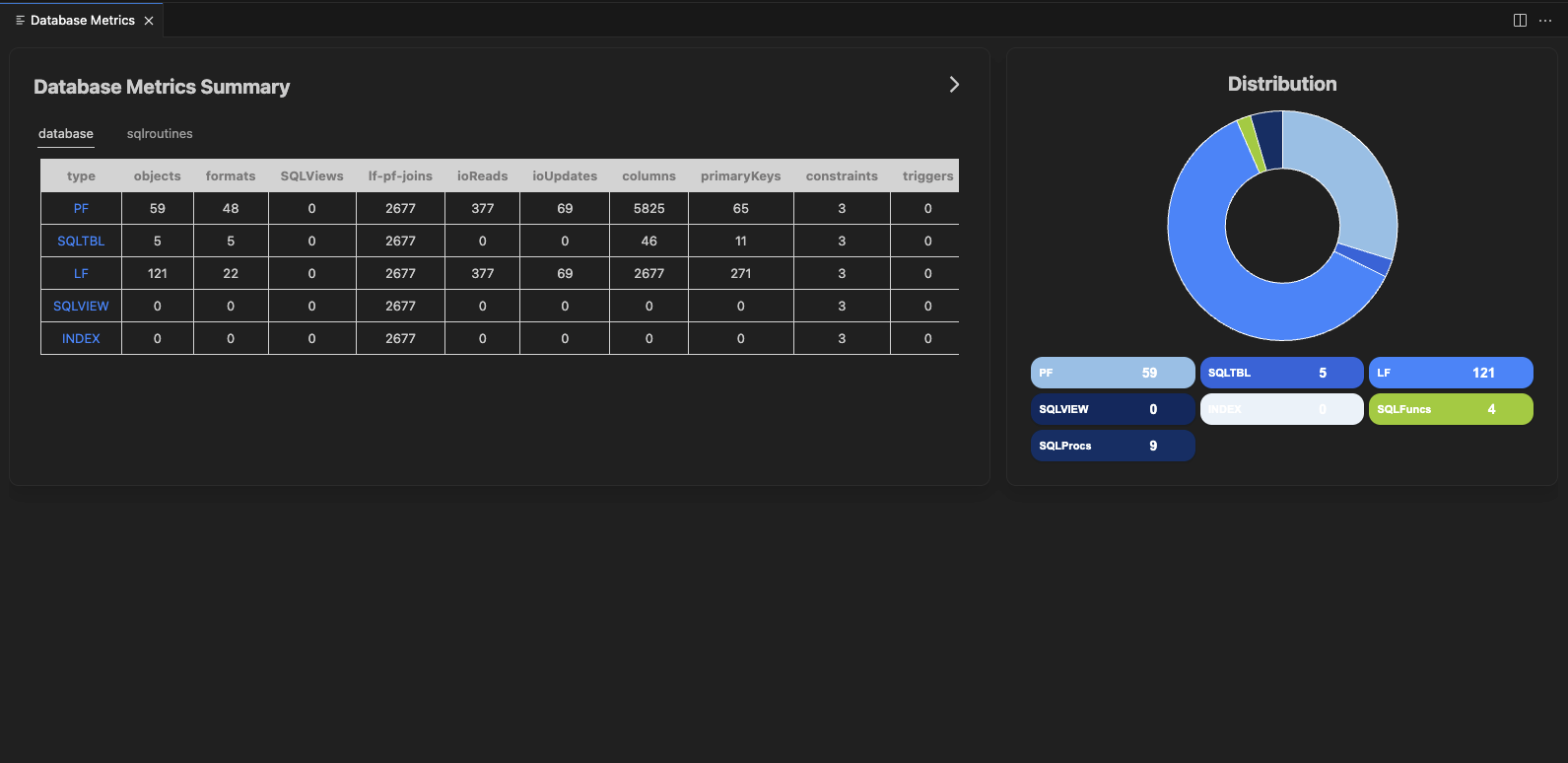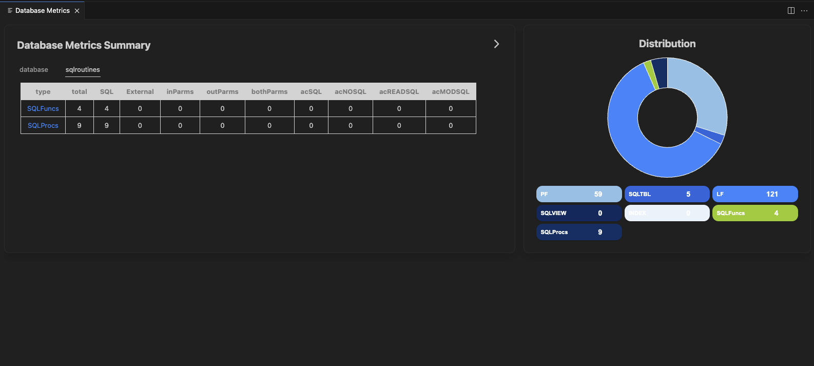 The metrics data at a detailed level is split between "Database" and "SQL Routines". Each has its own tab. It also displays the distribution of data in the doughnut chart format.