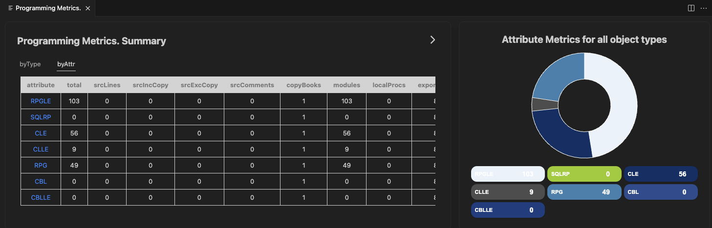The programming metrics categorises the data based on the attribute of the objects in Attribute tab. It shows the clickable attribute information in the tabular form and also displays the different attributes data in pictorial form using doughnut chart.