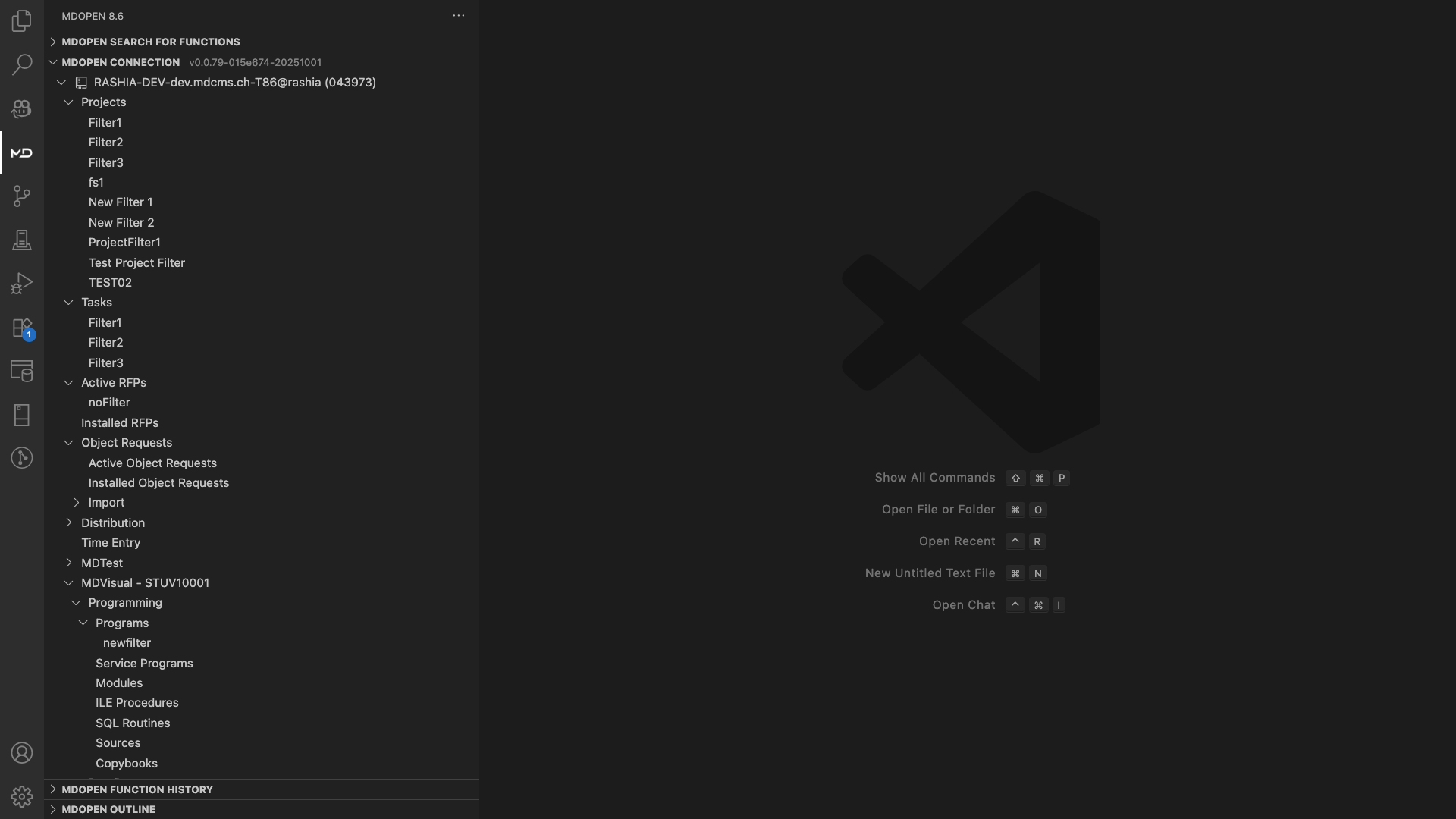 After logging in, you are taken to the MDOpen Home Page within VS Code, which provides a familiar coding workspace alongside dedicated IBM i tools.