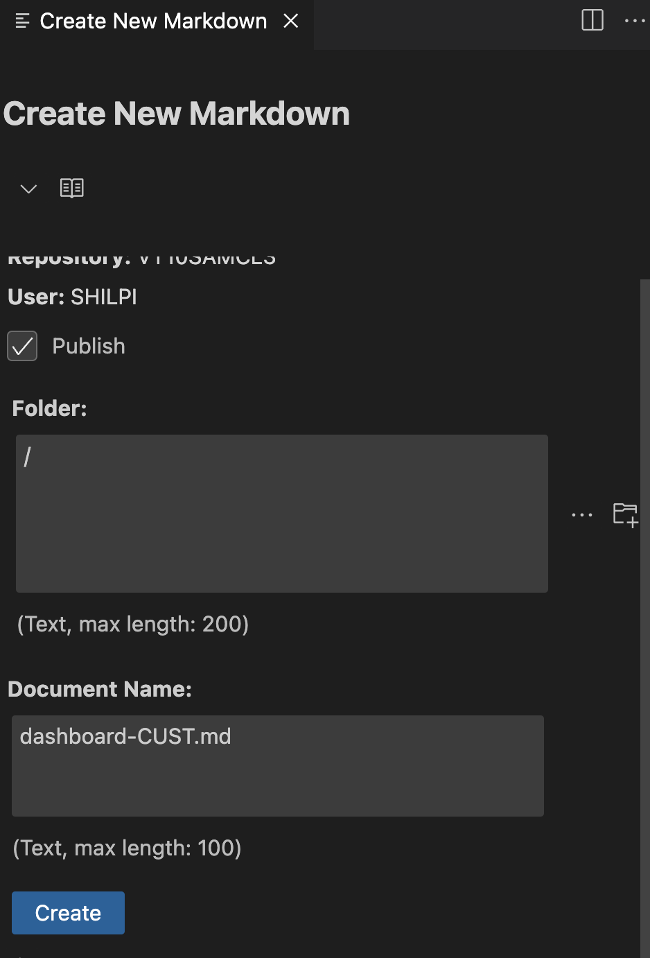 Click on Create button to create markdown file on server. Click to view Dashboard Diagram Markdown Report