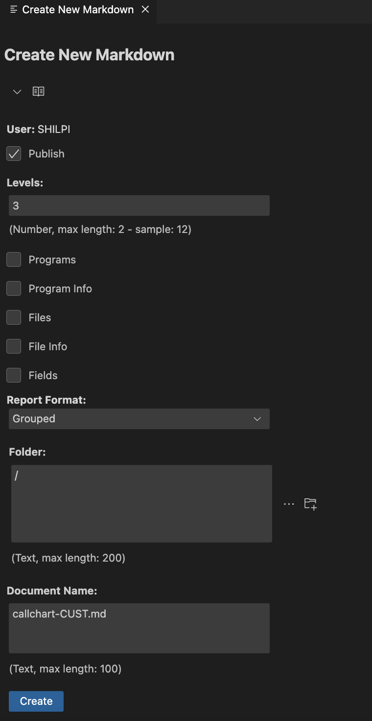 Click on Create button to create markdown file on server. Click to view Call Chart Markdown Report