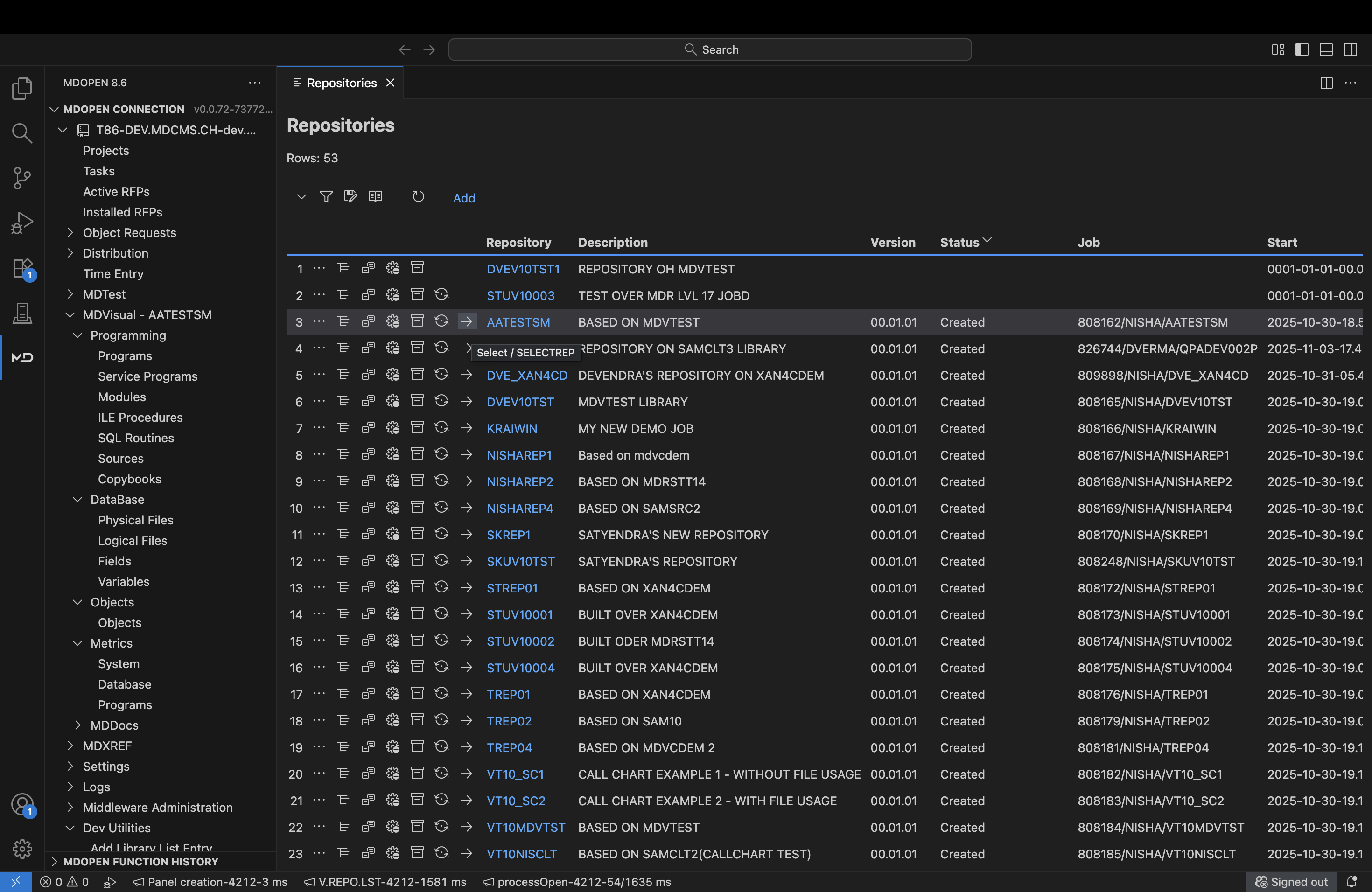 Once selected, the repository becomes active, and its analyzed data is automatically displayed in the left navigation panel — showing all categorized components such as: - Programming – Programs, service programs, modules, ILE procedures, SQL routines, and sources.
